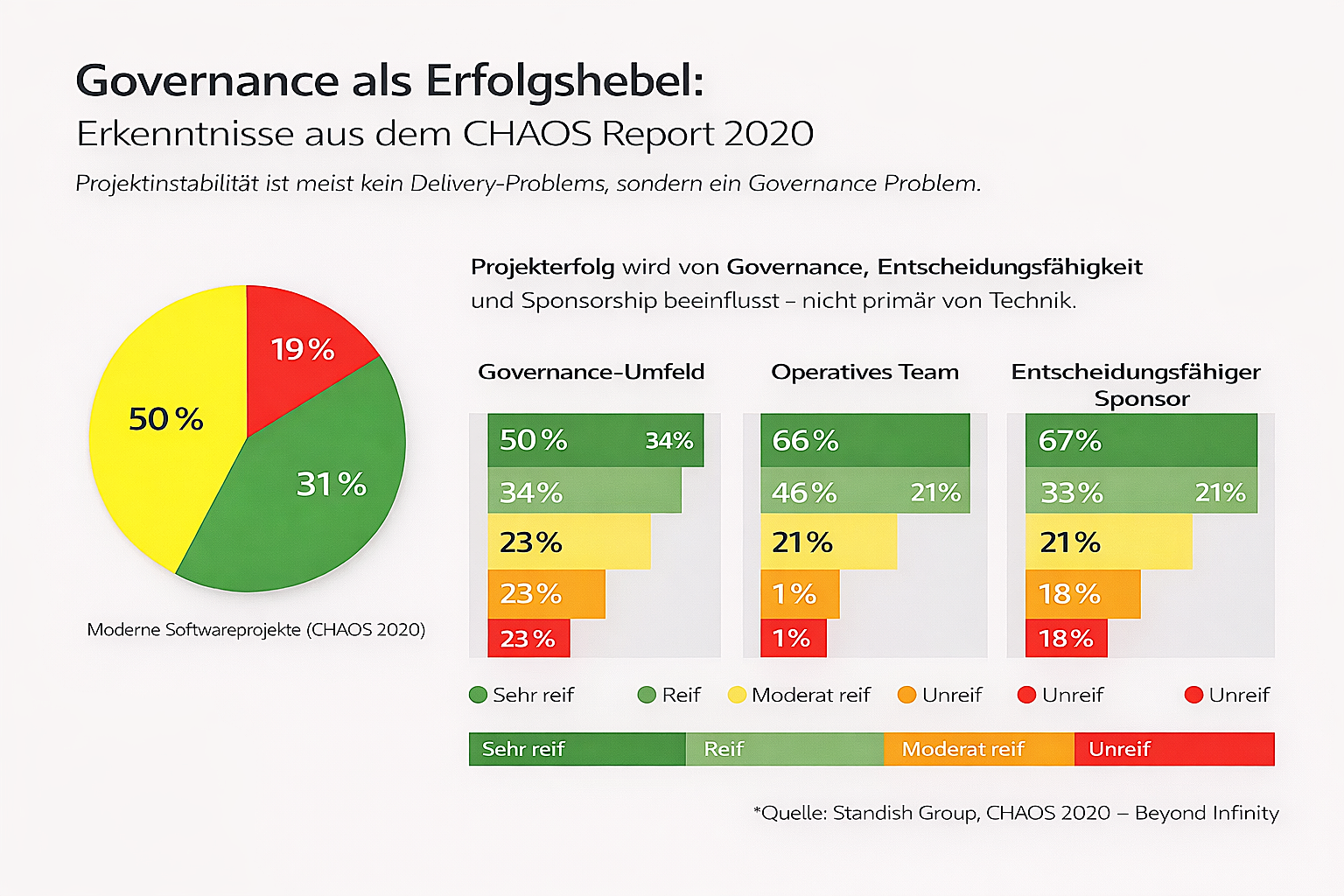 (Die Auswertung aus dem CHAOS Report 2020 zeigt: Nur 31 % der Softwareprojekte gelten als erfolgreich, während 69 % scheitern oder dauerhaft „challenged“ bleiben. Die Daten machen deutlich, dass Projekterfolg primär von Governance, Entscheidungsfähigkeit und Sponsorship abhängt – nicht von technischer Exzellenz. Reife Governance- und Sponsorenstrukturen erhöhen die Erfolgswahrscheinlichkeit signifikant, selbst bei unveränderter Delivery-Leistung. Projektinstabilität ist damit weniger ein Umsetzungsproblem als ein strukturelles Entscheidungs- und Verantwortungsproblem. Auch wenn der Report bereits einige Jahre zurückliegt, ist immer noch zu beobachten, das Entscheidungen zu lange hinausgezögert werden, gerade in einer “Fail fast&Learn fast” Kultur. )