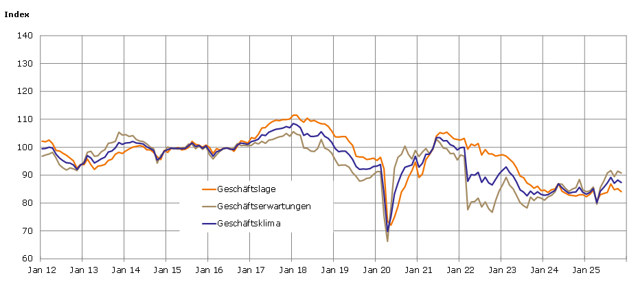 Im November trübte sich das Geschäftsklima nach der Verbesserung im Vormonat wieder ein. Dies war auf beide Teilindikatoren zurückzuführen: Die Unternehmen haben sowohl ihre Einschätzung der aktuellen Geschäftslage als auch ihre Erwartungen für die nahe Zukunft leicht nach unten korrigiert.