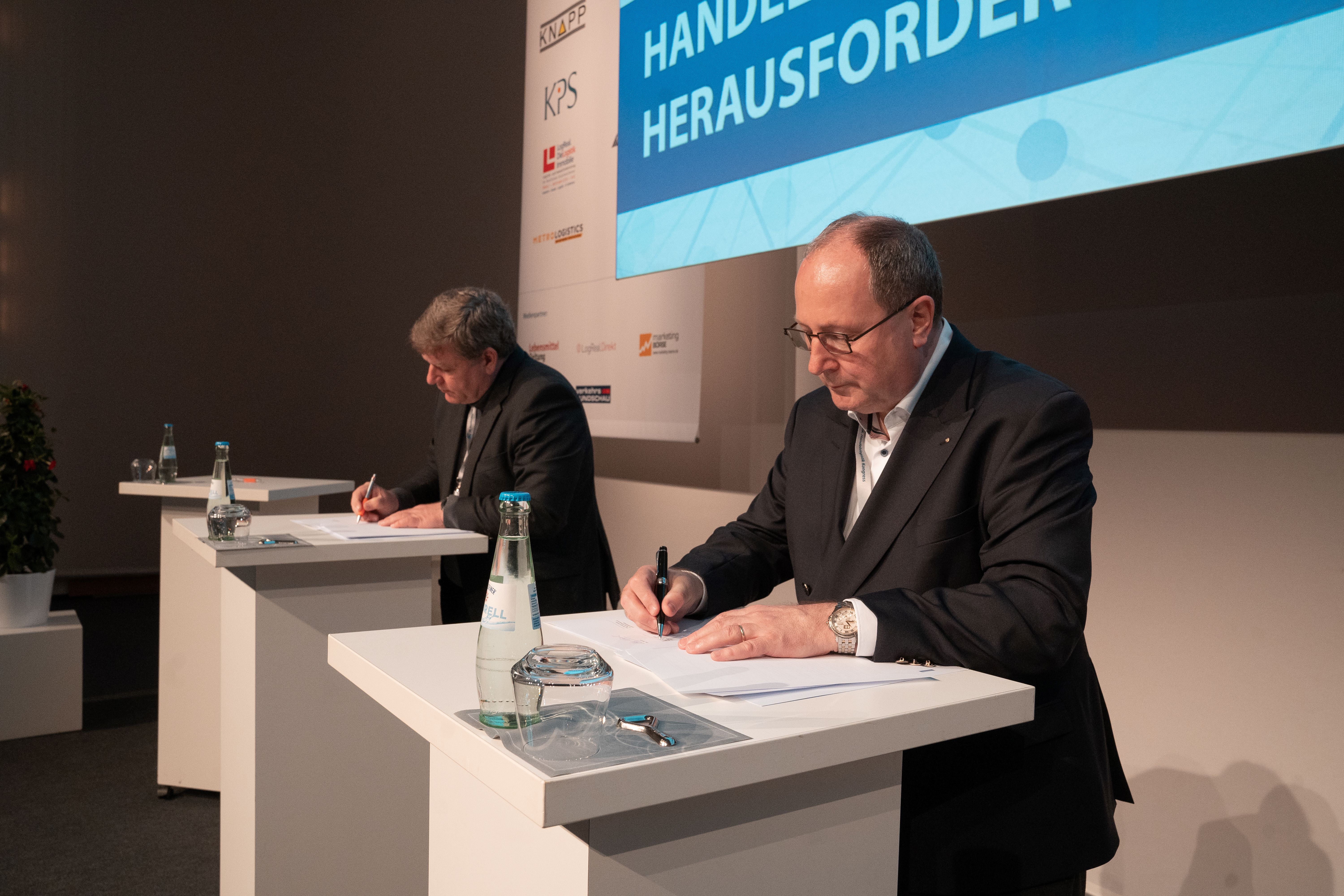 Thomas Fell, Lead GS1 Germany (li.) und der BVL-Vorstandsvorsitzende Prof. Thomas Wimmer (re.) unterzeichnen im Rahmen des Handelslogistik Kongresses Log2022 die Vereinbarung zum Aufbau einer Cloud-Plattform für den digitalen Lieferschein.