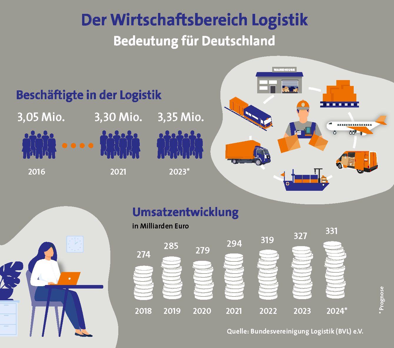 Infografik mit Umsatz und Beschäftigung in Logistik und Supply Chain Management in Deutschland als PNG für die digitale Verwendung.